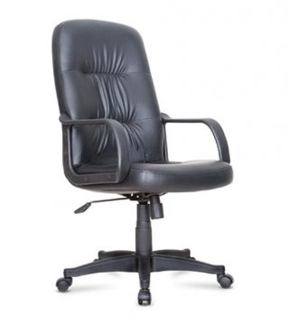 Synthetic leather office chair with fixed arm rest and coventional tilt mechanism.